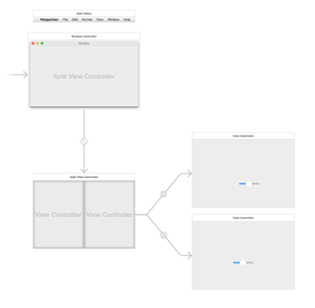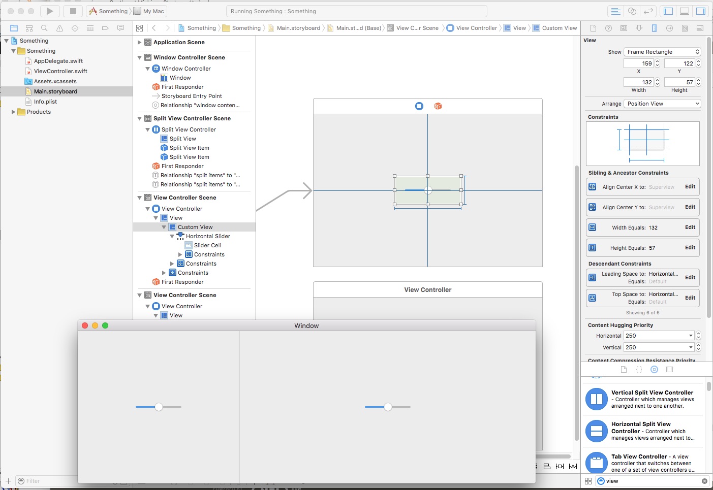 我刚刚创建了NSSplitViewController。把它放在故事板上。把它作为窗口内容。并在每个子视图控制器上添加了一个滑块。