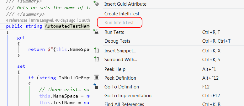 如果一个方法访问属性,那么IntelliTest将作为探索该方法本身的一部分来探索该属性。但是,在发布之前,我们确实发现了在直接在属性访问器上启动运行IntelliTest和/或创建IntelliTest命令时出现的一些问题。因此,我们决定禁用它,直到我们看到足够的需求。但是,正如您所展示的,它并没有被完全禁用。