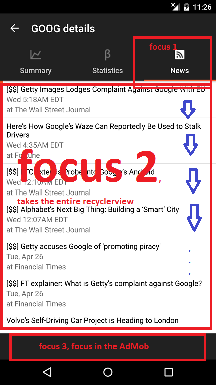 </LinearLayout>更新:这是我现在收到的焦点顺序:红色是我现在得到的焦点顺序,当我从选项卡到下点击一次时,RecyclerView(整个reycclerview)得到焦点,再单击一次,AdMob(黑色显示)得到焦点。蓝色箭头是我在RecyclerView里面想要的