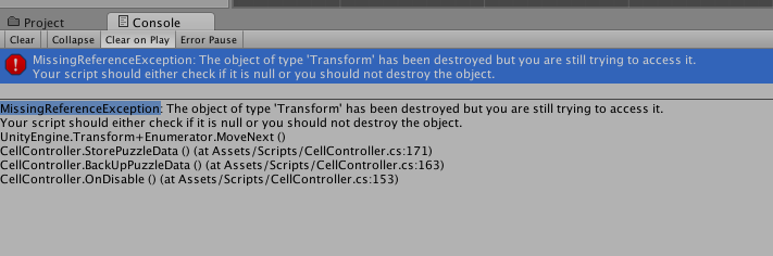 }但是,当OnDisable方法在该时间控制台被调用时,给出了以下错误: