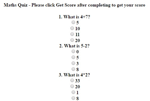 <h4 align="center">Maths Quiz - Please click Get Score after completing to get your score</h4>