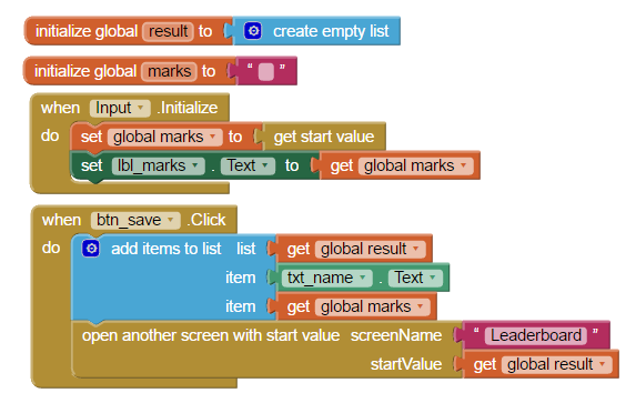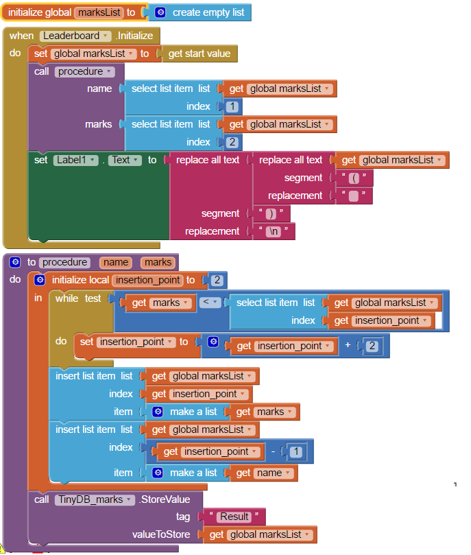 startvalue事件中的Leaderboard.Initialize只是要添加到过程procedure后面的marksList的子列表,而不是完整的列表本身。顺便说一句。您可能要重命名该procedure,例如,将其重命名为insertMarks.