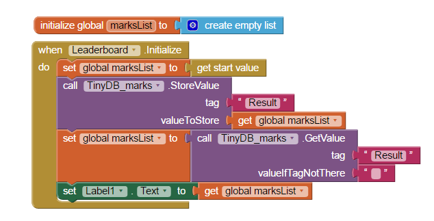 在Leaderboard.Initialize事件中,您应该使用TinyDB块读取来自TinyDB.GetValue的结果,并将其分配给全局变量marksList。
