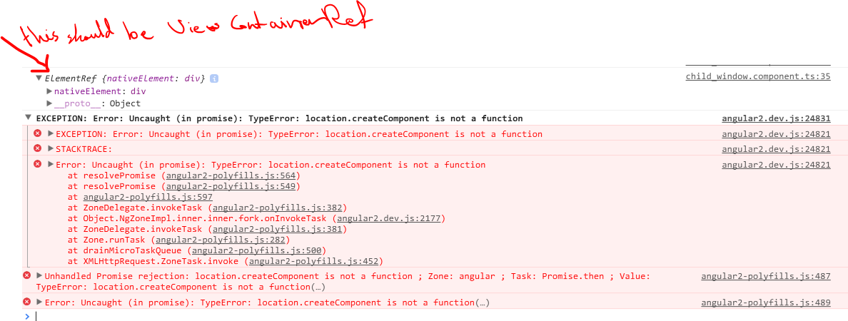 我登录到控制台我从@ViewChild得到了什么,我想得到一个ViewContainerRef,但是我得到了ElementRef,这会导致错误。如何解决这一问题
