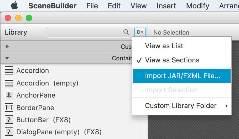 若要添加jar,请转到左上角的Library面板,并在搜索字段的右侧单击小引擎按钮。选择Import JAR/FXML Files...,找到您的jar并单击导入。您可以选择可以添加哪个jar组件。
