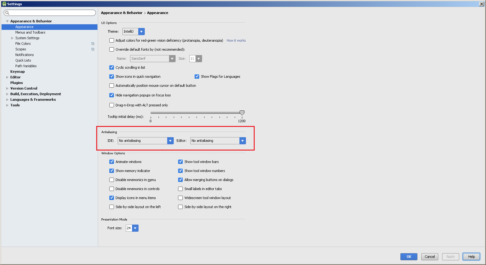 在Windows764位上,在AndroidStudio1.5中,我有一个很好的单间距14字体,没有反走样/平滑,我很喜欢。然而,在最近安装的AndroidStudio2.1(所有据称从AS1.5导入的设置)中,反别名/平滑应用于我的字体。怎么关机?谢谢。