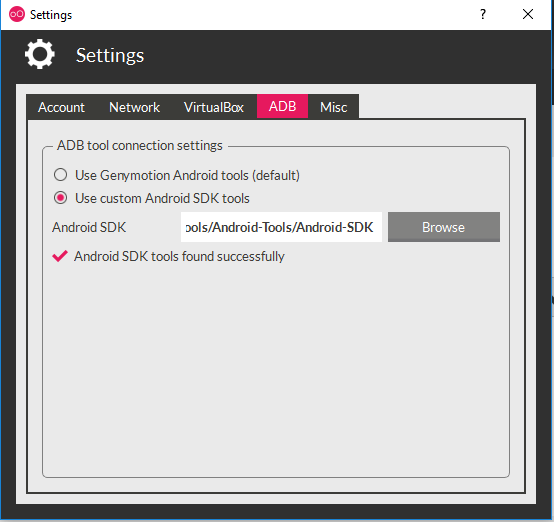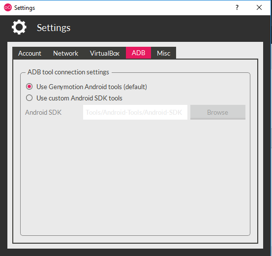因此,在安装Genymotion-ARM- the _v1.1.zip之前,ADB连接设置为默认设置。如你所见:
