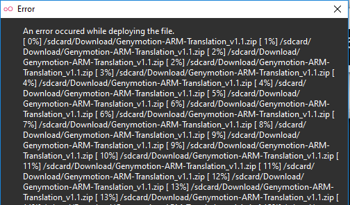 但是,直到3(拖放Genymotion-ARM-Translation_v1.1.zip)之后,它在部署文件时发生了一个错误。