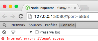 我发现节点检查器无法工作,并在一段时间后导致控制台日志中的“内部错误:非法访问”(每个新的调试会话都不同)。