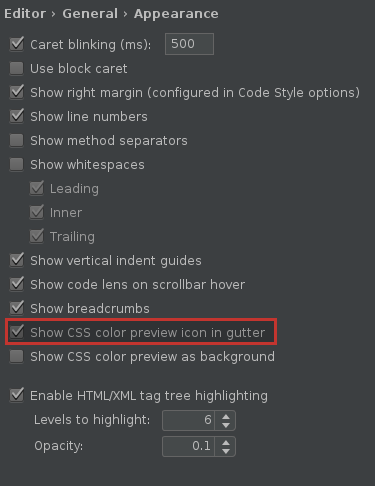 例如,以前,在PhpStorm 9中,我可以在地沟中看到css颜色预览图标: