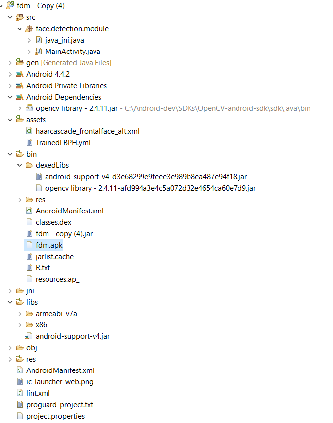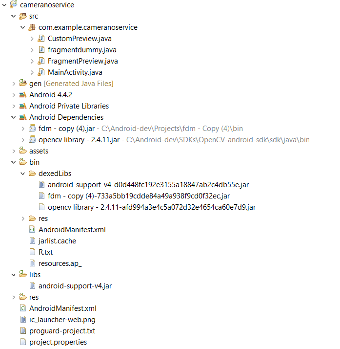 我认为编译器找到了这个jar的副本-- "Opencv库-2.4.11.jar“。您试着检查一下这个.jar是否也是对的调用。如果是这样的话,那么从中删除这个.jar。