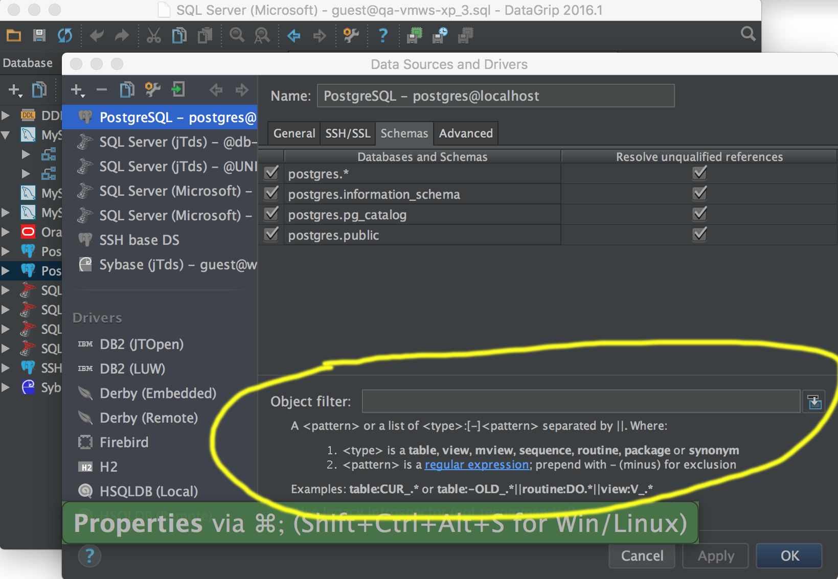 如何像我们在server管理演播室中一样过滤DataGrip中的对象?