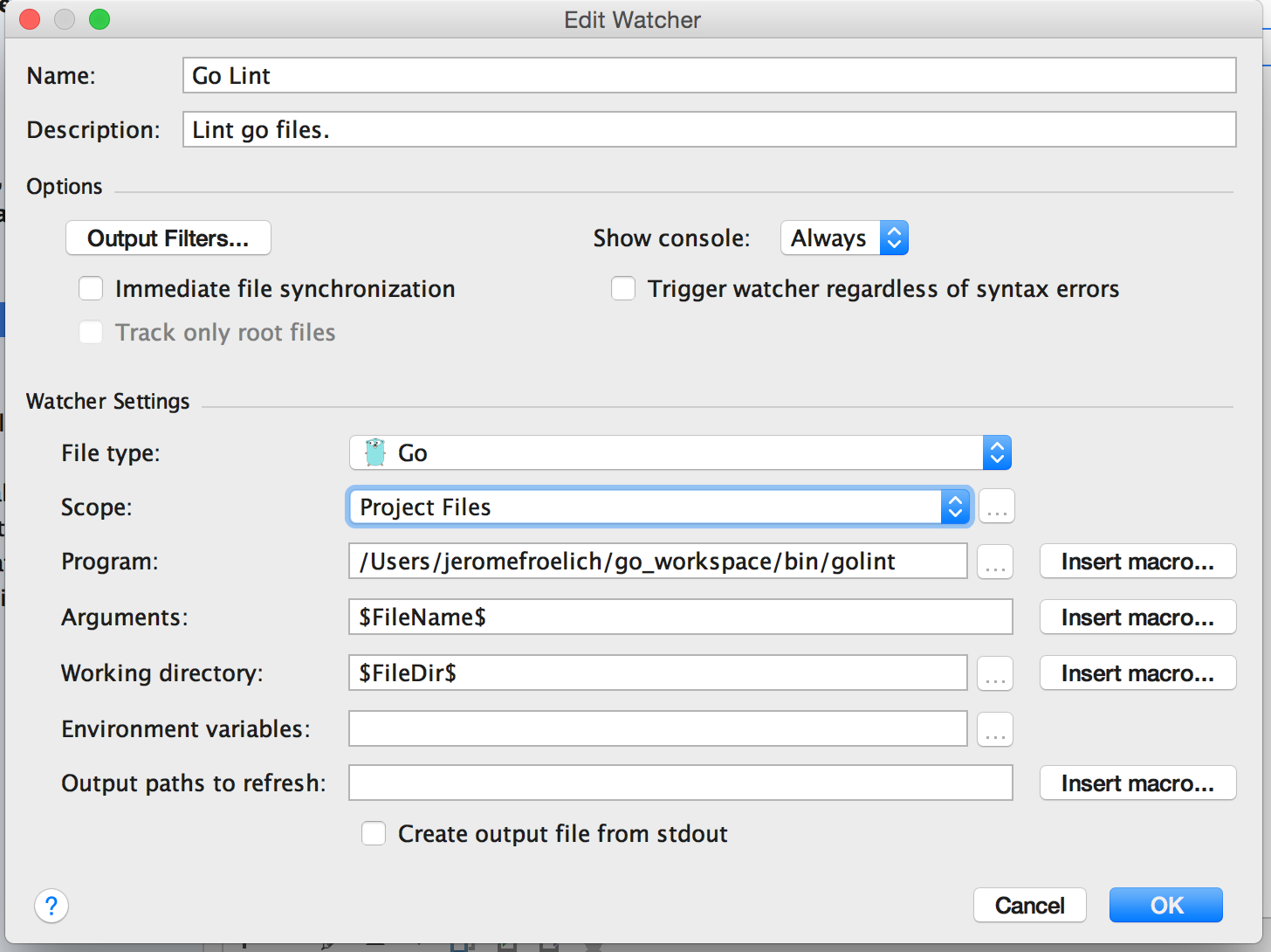 我最近一直在使用Intellij Golang插件(很棒),但是我设置的File遇到了一个问题。我的工作目录被设置为我的$GOPATH目录,我希望能够在保存我正在处理的文件之后运行golint和goimports。我遇到的问题是,如果我下次打开Intellij时使用git来克隆回购,那么它会在所有新导入的文件上同时运行golint和goimports,大型项目需要很长时间。是否有一种方法来设置文件监视程序,使其只监视当前打开的文件?我在下面添加了当前设置的屏幕截图: