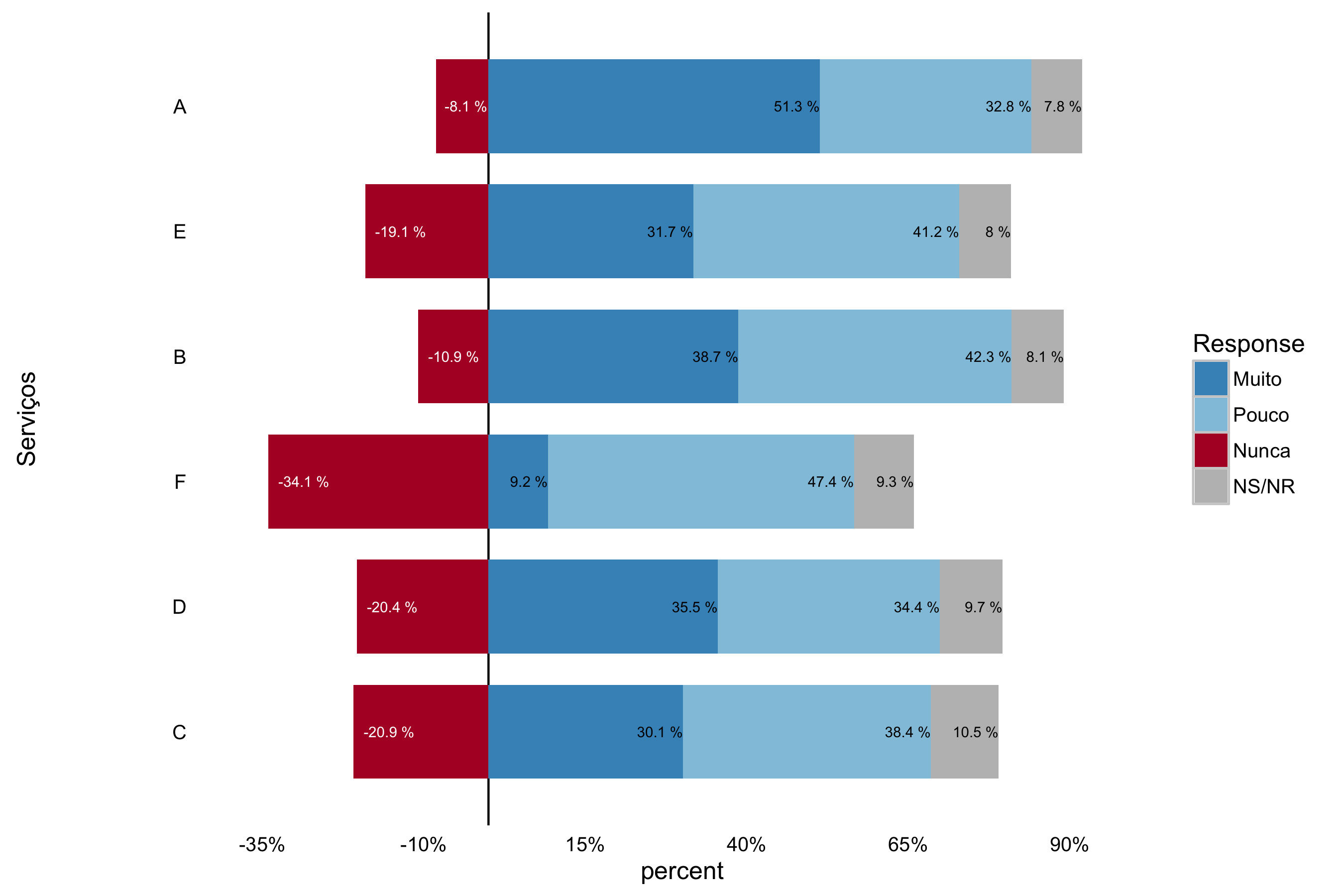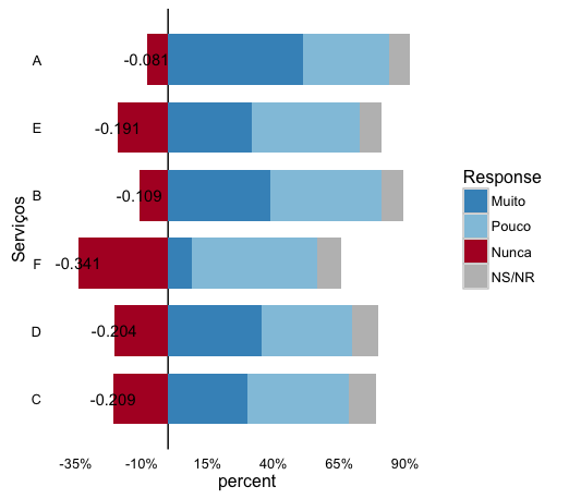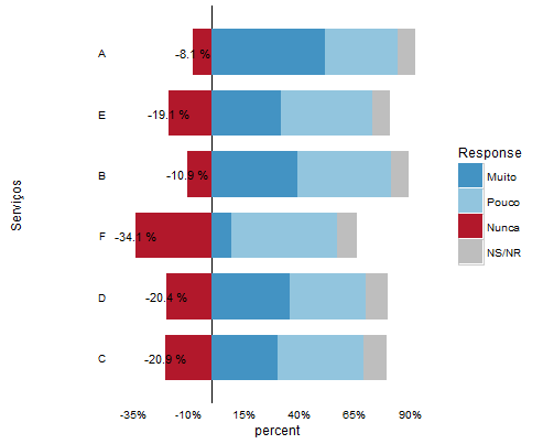 gg <- gg + geom_text(data=filter(lik, percent<0), aes(x=Serviços, y = percent, group=Response,label = paste(percent*100, "%")), position = "stack", hjust = -.2, size = 2.5, color="white")