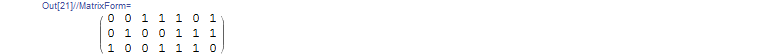 CoefficientList[MultiplicativeGroup, a]{ 1},{0,1},{0,0,1},{1,0,1},{1,1},{1,1},{0,1,1},但我坚持将其转换为二进制矩阵形式。它必须看起来像这个: