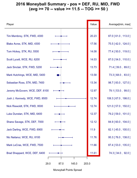 forest(x = final$AvgPts, ci.lb = final$min, ci.ub = final$max, slab = final$Players,ilab = final$value, ilab.xpos = max(final$max)+10,ilab.pos =4,yaxs="i", alim = c(min(final$min)-5, max(final$max)+5),steps = 4, xlim = c(min(final$min)-200, 2*(max(final$max)+5)), xlab = "Moneyball Points Spread", efac = 0.75-.0014*k, cex = 0.75, mgp = c(1, 1, 0),refline=mean(final$AvgPts),digits=1,col="dark blue",pch = 19,main=paste("2016 Moneyball Summary - pos =",paste(as.character(pos), collapse=", "),"\n(avg >=",points,"-- value >=",val,"-- TOG >=",time,")"))