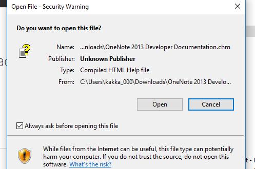 因为从互联网下载的文件--包括这些ZIP文件中包含的zip文件和CHM文件--被标记为来自Internet,因此可能是恶意的,因此不能在本地机器上获得浏览权限。