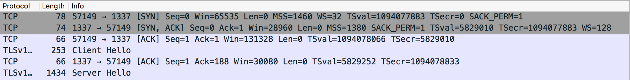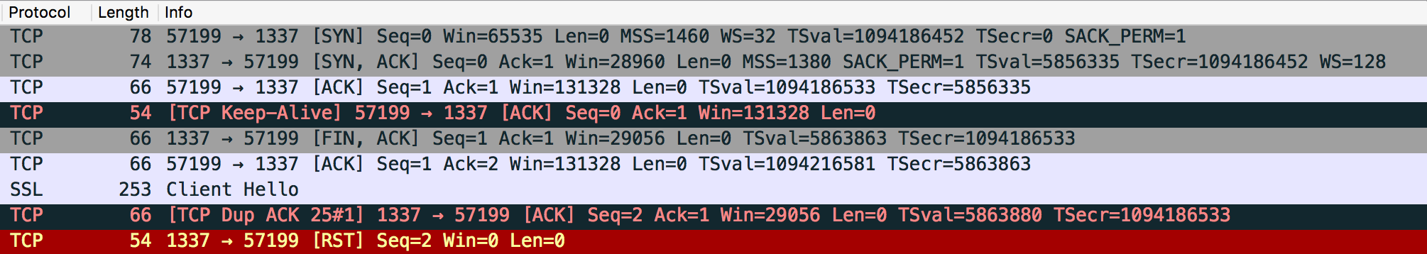 我对发生了什么事一无所知。我不知道为什么Obj版本用TLS v1.2启动客户机Hello,但是Swift尝试使用TLS v1.0,然后放弃。不知道为什么Swift版本要花这么长时间才能向客户发送Hello,一个Keepalive数据包是优先发送的?任何帮助都将不胜感激。