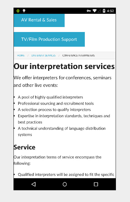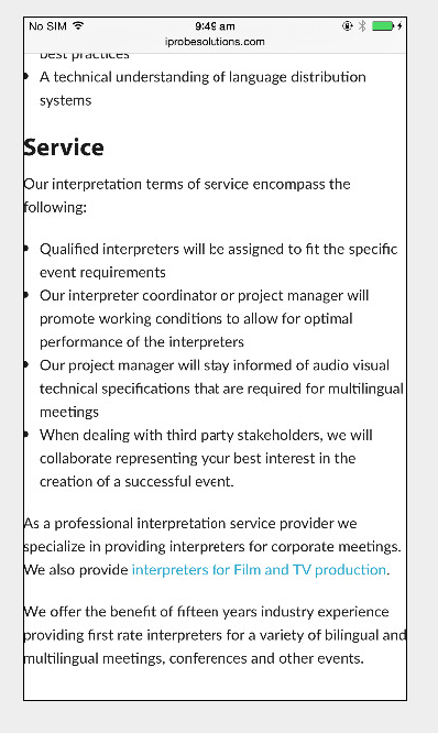 下面是http://iprobesolutions.com/event-support/conference-interpreters的两个浏览堆栈截图,一个是iPhone 6 +,另一个是Google 6。