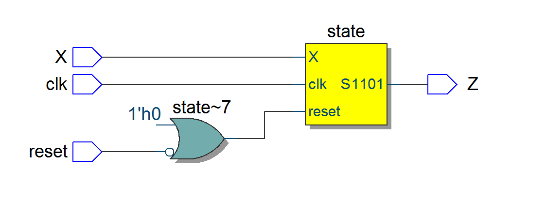 OR门简单地命名为state~7,就像黄色框名为state一样。因此,OR门只是一个逆变器,所以复位到state块是not reset作为外部复位输入。