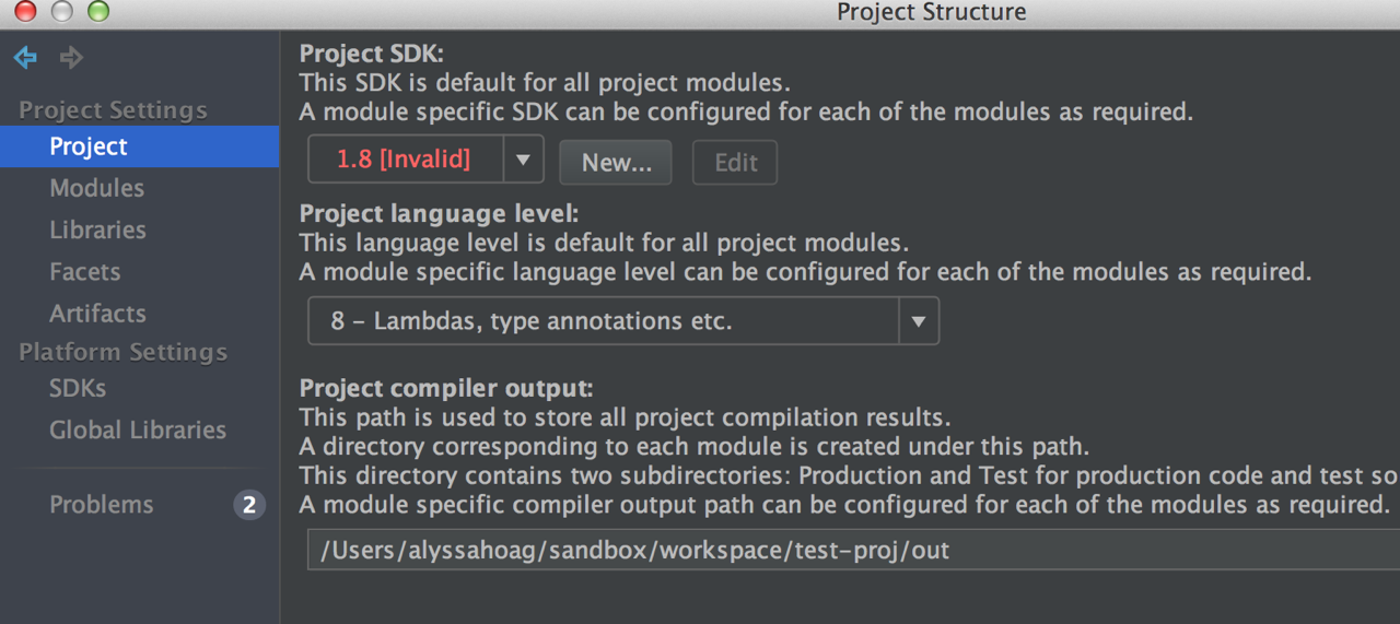 因此,IntelliJ似乎找不到我默认的Java8JDK。我知道操作系统可以根据和javac -version的控制台输出找到、JRE和JDK。但是,在sdkman、Gradle或IntelliJ之间,某些东西阻止了IDE找到Java。有什么想法吗?