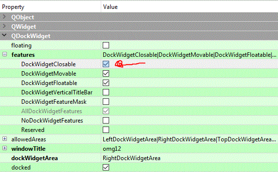 我想使用一个QDockWidget设置QT DockWidgetClosable属性。然而,它是在“特征”的内部属性。