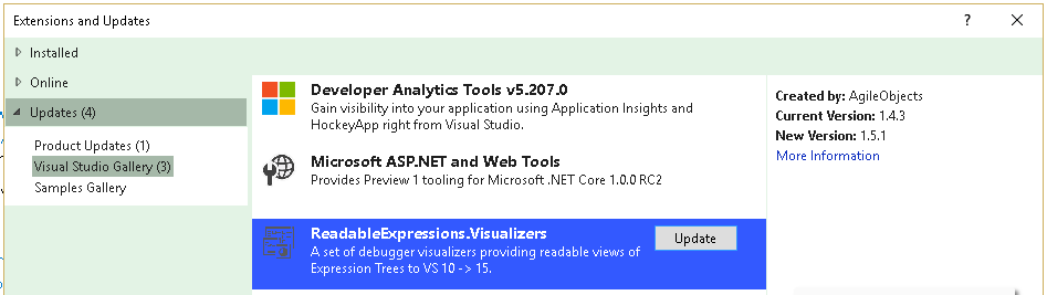 示例中成功查询的两个扩展是NuGet客户端工具 for VS2015和工具箱。
