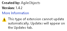 如果取消选择,则VSIX ID框将重新显示,然后重新选择扩展的受支持的Visual版本之一,因此我已经能够以这种方式分配ID。服务现在返回版本号,扩展管理器因此显示可用的更新: