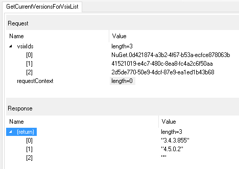 问题似乎是,当Visual扩展管理器查询扩展服务以获取我的扩展的最新版本时,它返回一个空字符串--这与使用无效扩展标识符进行查询的结果相同: