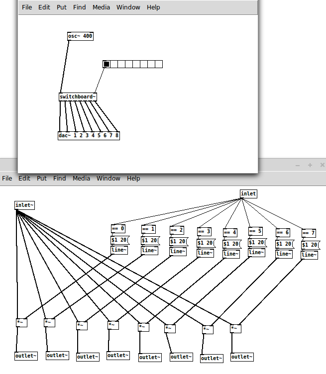 Pd-扩展不再被维护。您可以安装Zexy的香草Pd通过Debian软件包或Deken插件。然后您将拥有可用的demultiplex~对象。但是,可能有很好的理由说明您可能根本不想使用外部的。这里有一种方法来修补一种交换机。附加好处:您可以指定您最喜欢的淡出时间和类型。