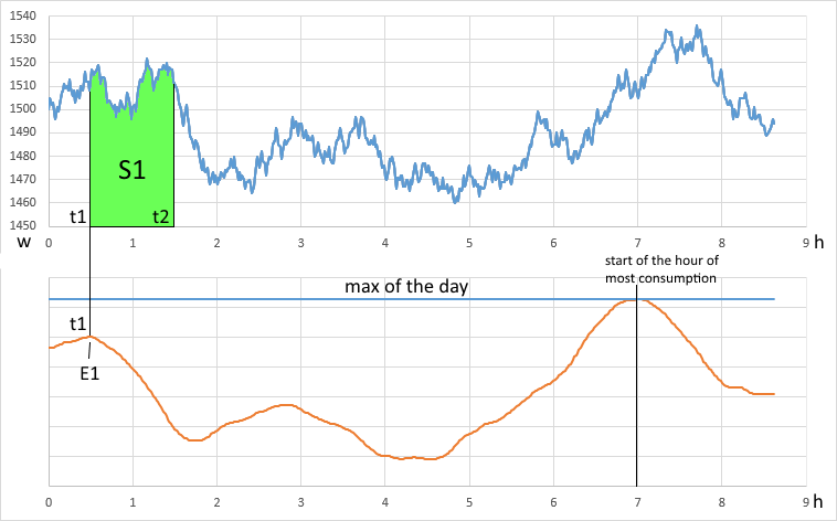 然后,您只需选择一天中最大的E1,以获得最耗电的时间,在这种情况下,h=7到7+1!