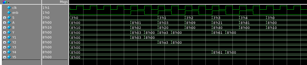 @(posedge clk); enb = 1'b1; A=8'b0000_0011; B=8'b0010_0000; S=3'b001; //tolak