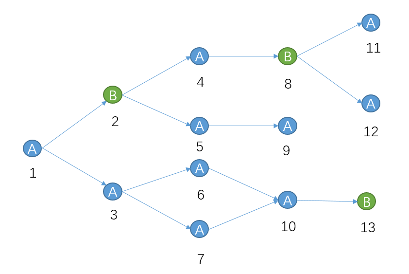 MERGE (A1:A {name:1})-[:connect]-(B2:B {name:2}) MERGE (A1)-[:connect]-(A3:A {name:3}) MERGE (B2)-[:connect]-(A4:A {name:4}) MERGE (B2)-[:connect]-(A5:A {name:5}) MERGE (A4)-[:connect]-(B8:B {name:8}) MERGE (B8)-[:connect]-(A11:A {name:11}) MERGE (B8)-[:connect]-(A12:A {name:12}) MERGE (A5)-[:connect]-(A9:A {name:9}) MERGE (A3)-[:connect]-(A6:A {name:6}) MERGE (A3)-[:connect]-(A7:A {name:7}) MERGE (A6)-[:connect]-(A10:A {name:10}) MERGE (A7)-[:connect]-(A10) MERGE (A10)-[:connect]-(B13:B {name:13}) RETURN *更新(搜索非A-type节点):