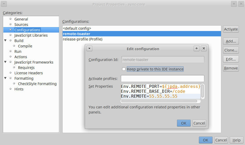 - In "Set properties" add:Env.REMOTE_BASE_DIR= Env.REMOTE= Env.REMOTE_PORT=${jpda.address} Env.RSYNC_OPTS=