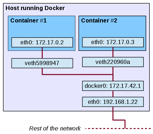 默认docker0桥和主机以太网设备之间没有直接链接。如果对容器使用--net=host选项,那么主机网络堆栈将在容器中可用。