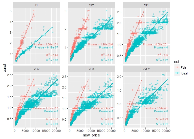 formula = formula, parse = TRUE, size = 3)除了R2之外,我还想将p值添加到这些方面。我可以通过首先运行回归,然后获取p-值并使用geom_text()添加这些p-值similar to the answer of this question.来手动完成这一操作。