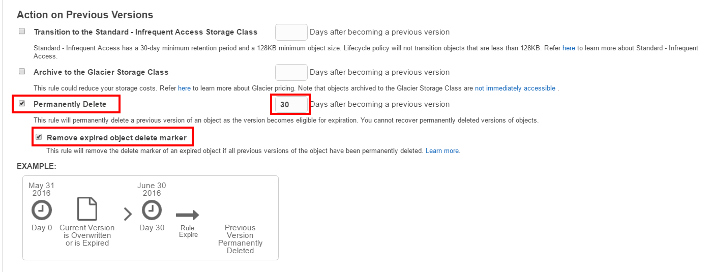 是的,您只有在30天后才能删除版本的正确设置。在S3控制台的上一页上,您可以选择要删除以前版本的前缀或整个桶。