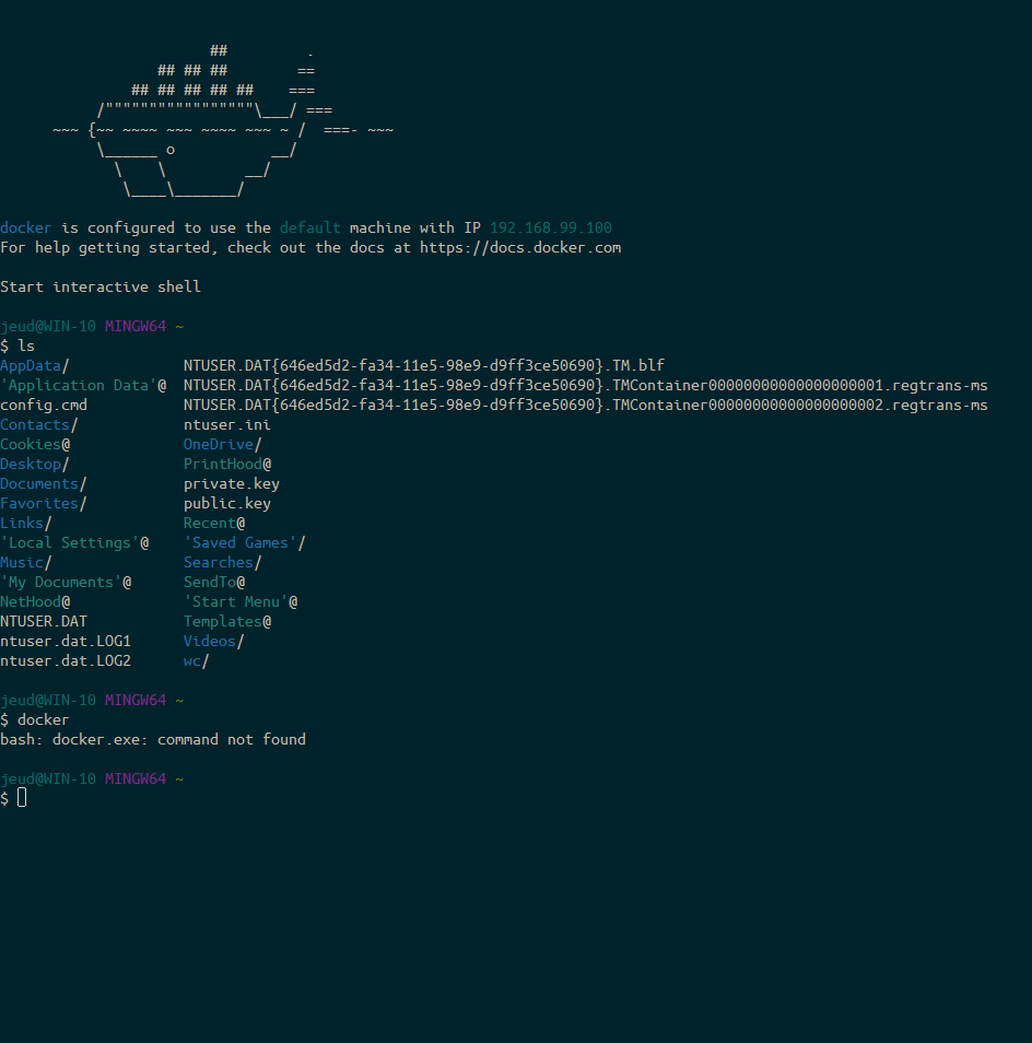 这就是结果,我可以看到鲸鱼,但我不能使用任何docker命令,我得到了错误:bash: docker.exe:命令未找到