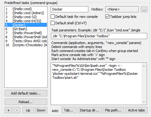任务参数:/dir "C:\Program Files\Docker Toolbox"命令:"%ProgramFiles%\Git\bin\bash.exe" --login -i -new_console:C:"C:\Program Files\Docker Toolbox\docker-quickstart-terminal.ico" "%ProgramFiles%\Docker Toolbox\start.sh"