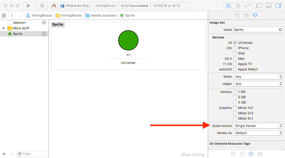 例如,如果你的游戏支持任何运行iOS 9的设备,那么Xcode就会自动生成1x,2x和3xPNG(位图)图像。