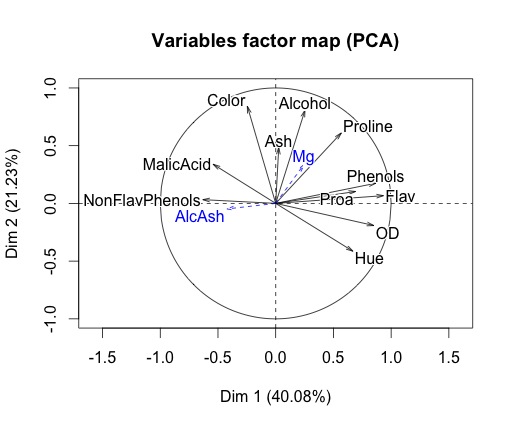 wine.pca <- PCA(wine, scale. = TRUE, quanti.sup = c(4,5))