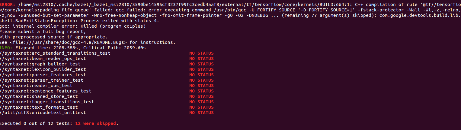 当我运行"bazel test syntaxnet/.util/utf8 8/.“时,所有测试目标都被跳过。错误代码如下所示。