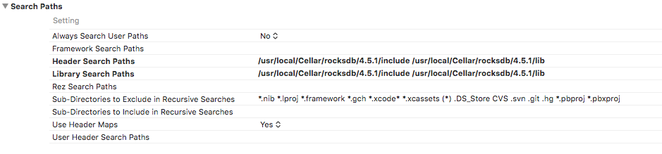将rocksdb库添加到Xcode中的头和库搜索路径后,如下所示: