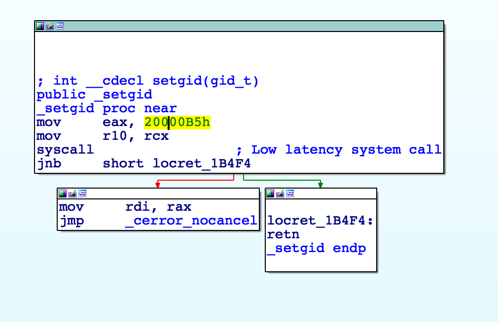 #define SYSCALL_NUMBER_MASK (~SYSCALL_CLASS_MASK)所以0x20000B5 & 0xFF000000 = 0xB5 (SYS_setgid)