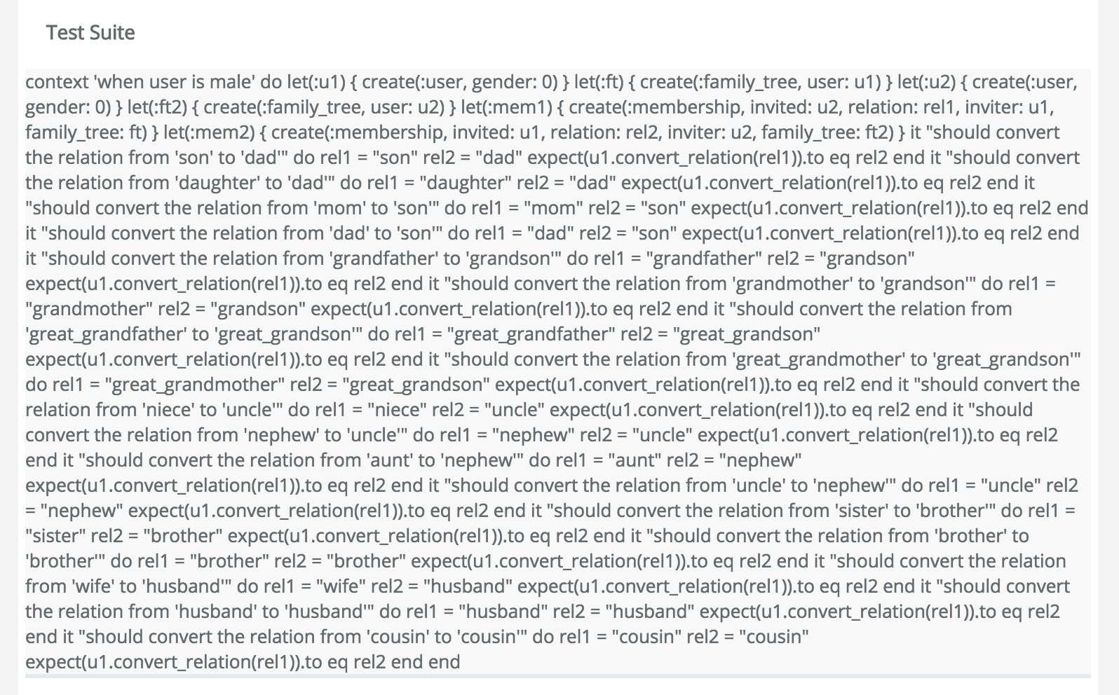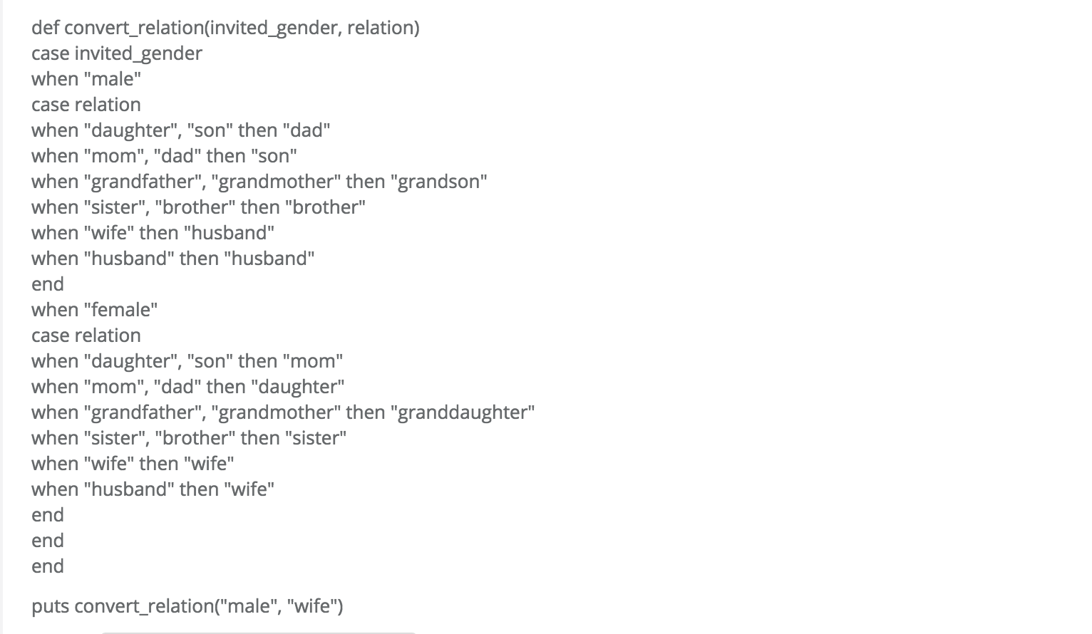 => "def convert_relation(invited_gender, relation)\r\n case invited_gender\r\n \twhen \"male\"\r\n \tcase relation\r\n when \"daughter\", \"son\" then \"dad\"\r\n when \"mom\", \"dad\" then \"son\"\r\n when \"grandfather\", \"grandmother\" then \"grandson\"\r\n when \"sister\", \"brother\" then \"brother\"\r\n when \"wife\" then \"husband\"\r\n when \"husband\" then \"husband\"\r\n end\r\n when \"female\"\r\n \tcase relation\r\n when \"daughter\", \"son\" then \"mom\"\r\n when \"mom\", \"dad\" then \"daughter\"\r\n when \"grandfather\", \"grandmother\" then \"granddaughter\"\r\n when \"sister\", \"brother\" then \"sister\"\r\n when \"wife\" then \"wife\"\r\n when \"husband\" then \"wife\"\r\n end\r\n end\r\nend\r\n\r\nputs convert_relation(\"male\", \"wife\")"发布于 2016-06-09 09:09:54