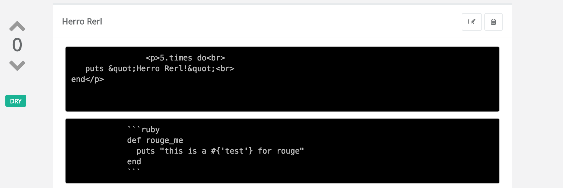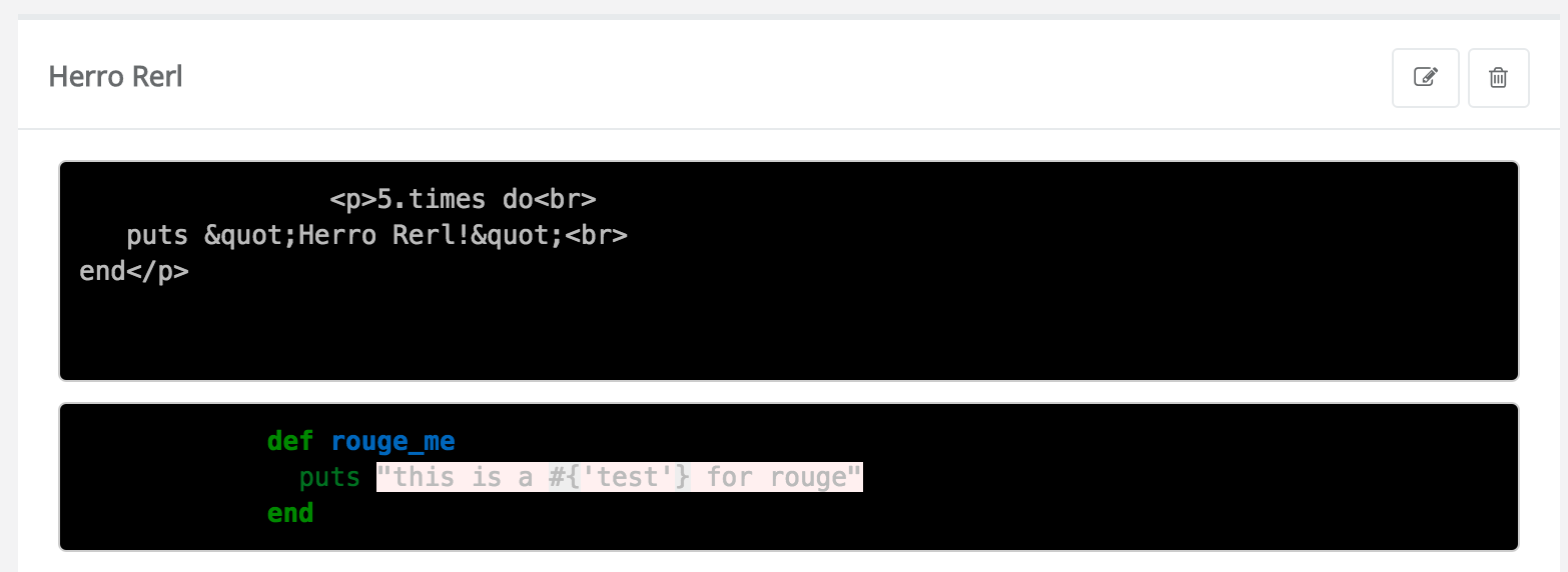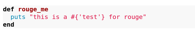 <%= raw rouge("def rouge_me\n puts 'hey!'\nend", "ruby") %>这将使: