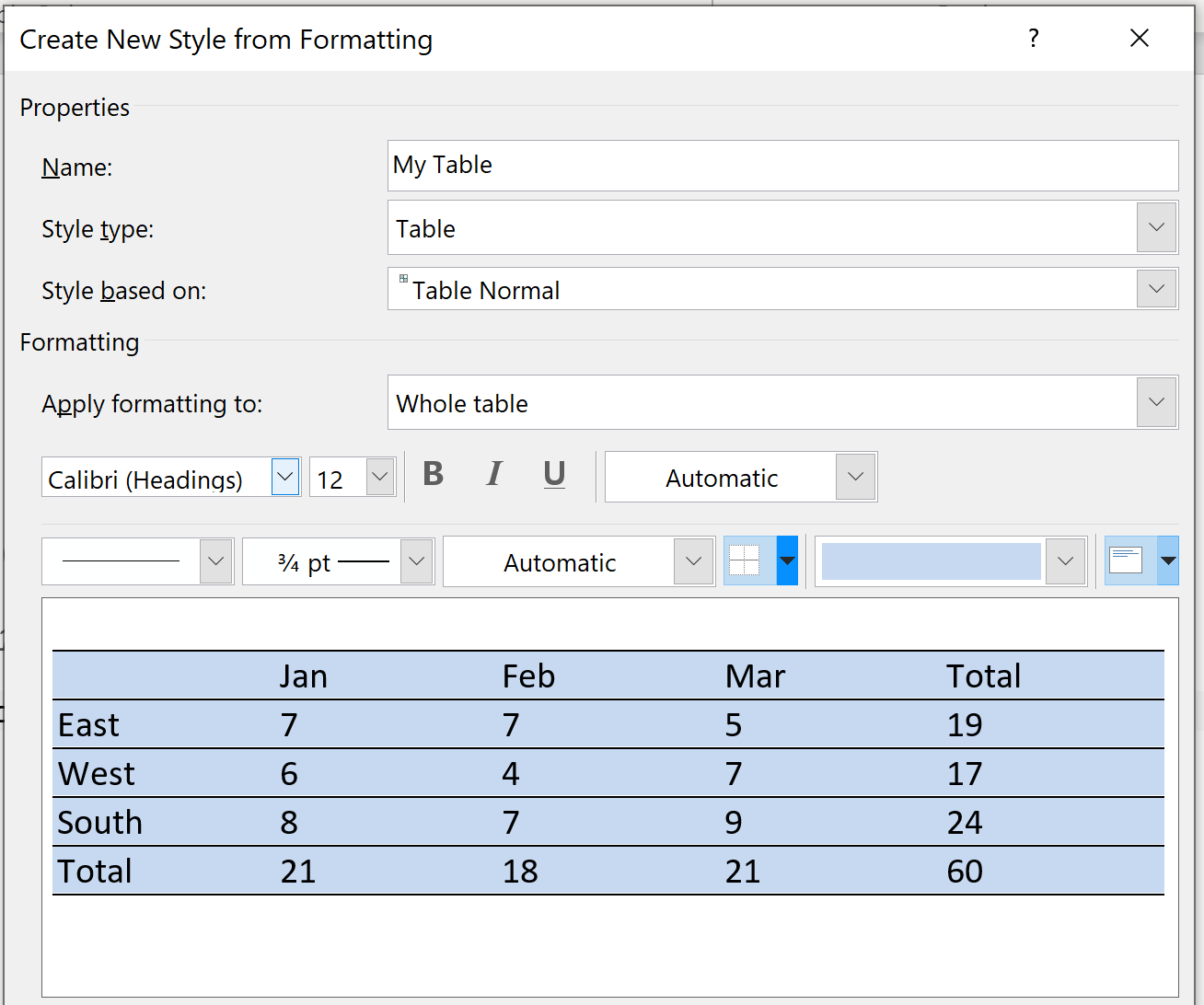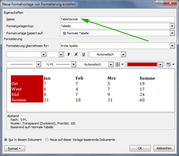 这里是用于定义TableNormal的表样式对话框的屏幕截图。不幸的是,它是用德语写的,但也许有人可以提供它的英文版本: