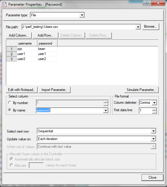 对于密码参数,我遵循相同的过程,给定名称参数名称为" password ",并选择相同的CSV文件,在“按名称”引用数据“->密码”(列头)下面。