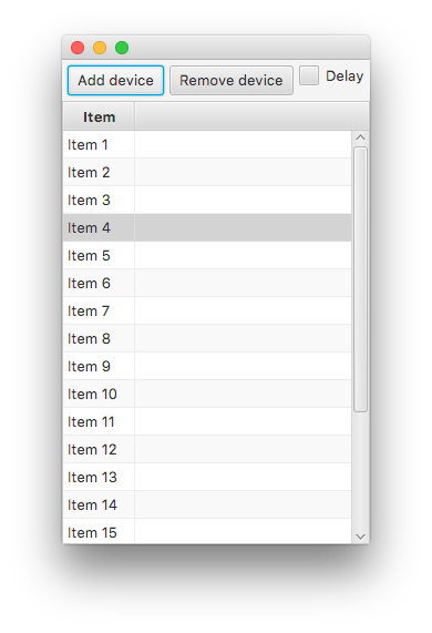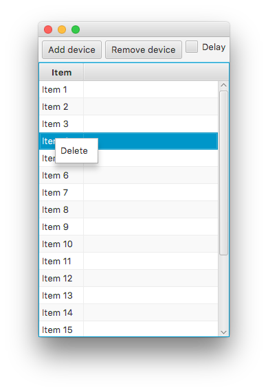 这是一个SSCCE。在本例中,表中最初有20个项,没有附加任何设备。每个菜单的上下文菜单只显示一个"Delete“选项,该选项删除项目。而不是一个更新项目的后台任务,我用一些控件来模仿它。您可以在表中选择一个项,然后按下"Add“按钮将设备添加到该表中:您随后将看到"Play on device.”出现在它的上下文菜单中。类似地,“删除设备”将删除列表中的最后一个设备。“延迟”复选框将设备的添加或删除延迟两秒钟:这允许您按下按钮,然后(快速)打开上下文菜单;在显示时,您将看到上下文菜单的更新。