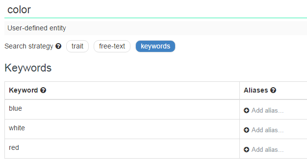 实体color是基于关键字列表进行识别的。因此,如果您有大量的数据作为用户输入的例子--您可以尝试先将其分解为“用户输入应该生成哪些实体”,然后从这些输入中进行关键字。